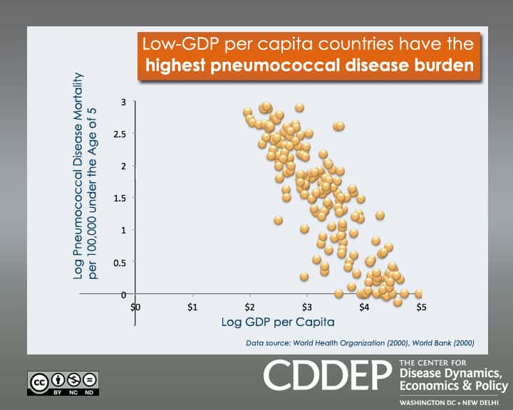 Pneumococcal diseases kill an estimated 826,000 under-5 year olds each year (O’Brien 2009). The burden of invasive pneumococcal disease is not evenly distributed across the world, but is generally highest in low-GDP per capita countries (World Health Organization 2000; World Bank 2000; O’Brien 2009) a relationship that holds for other diseases as well. The questions we need to ask then are: what policies are needed to help children in these countries live as long as their cohort in higher-GDP per capita countries? And, how can countries implement and finance those policies? PneuMOD is an evolving mathematical model that gives us a tool to rigorously address these questions.