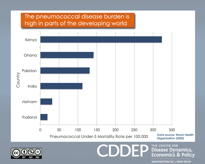 Pneumococcal disease is a leading cause of death for children under 5, particularly in developing countries. Using data from a 2000 WHO study, this graph shows the number of deaths per 100,000 children under 5 attributable to invasive pneumococcal disease, across six countries. Pneumococcal disease is frequently vaccine-preventable. Kenya, Ghana, and Pakistan have GAVI Alliance support to implement pneumococcal vaccination programs, and Kenya and Ghana have already introduced the pneumococcal conjugate vaccine (in February 2011 and April 2012, respectively). Research suggests that India could also reduce the burden of pneumococcal disease, particularly in the most affected regions, by scaling up access to vaccines and appropriate antibiotic treatments.