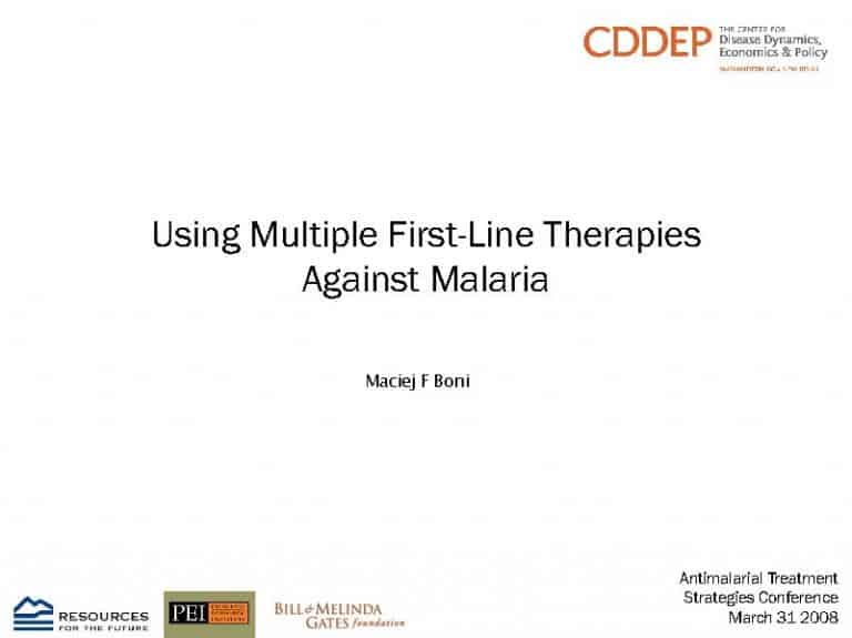 A power point presentation on the advantages of using multiple first-line therapies (MFT) against malaria, by Maciej F. Boni, Resources for the Future and Princeton University.